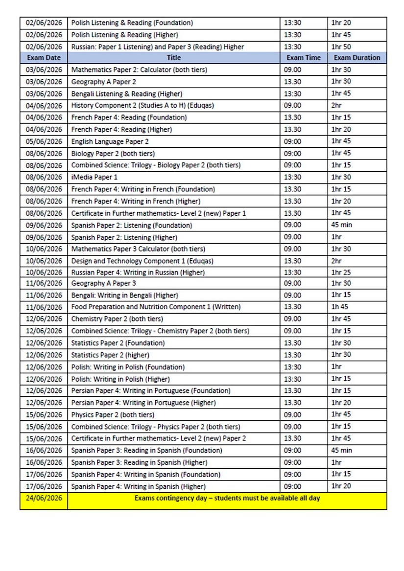 | GSCE Exam Contingency Day - Students must be available all day. | Wednesday 24th June 2026 |