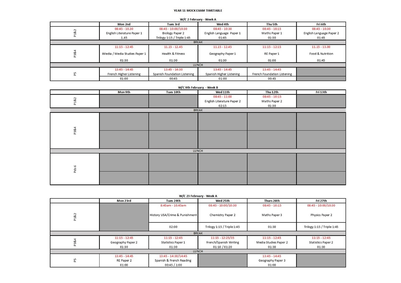 | Mock Exams Series 2 | Mon 2nd Feb to Fri 6th Feb, Wed 11th Feb, Thu 12th Feb and Mon 23 Feb to Fri 27th Feb |