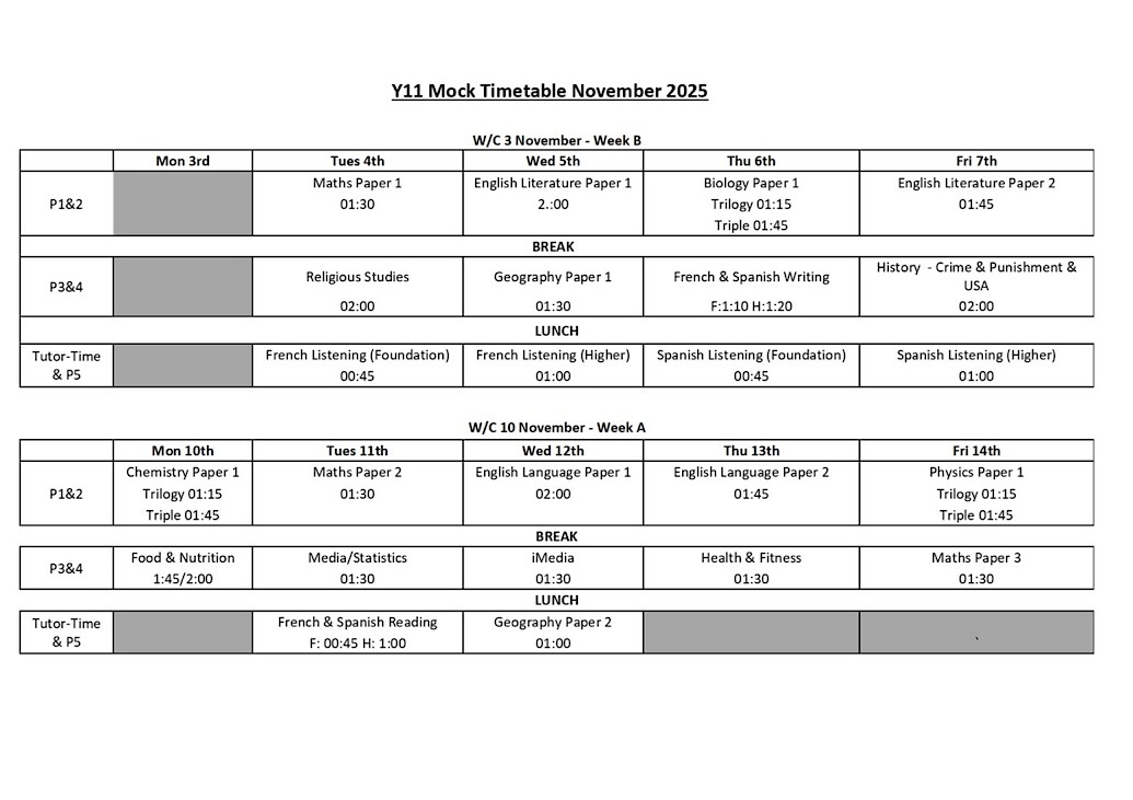 Tuesday 4th November - Start of New Term & Year 11 Mock Exams, Students will be on a Week B timetable
