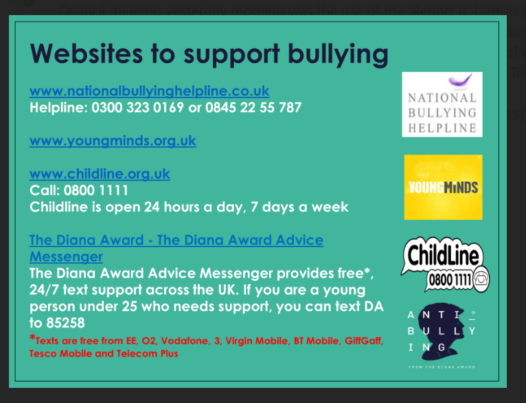 Online resources are available for students to access for support if they are experiencing issues with bullying.